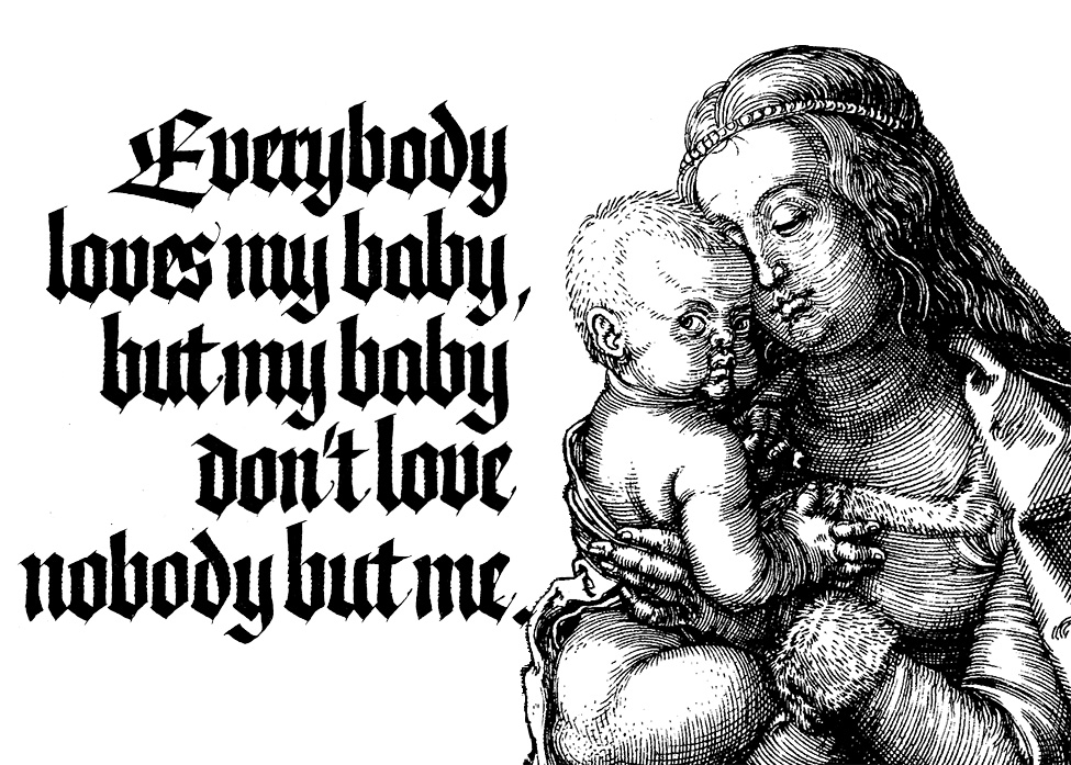 The image is from The Virgin and Child Seated by a Tree, 1513, by Albrecht Dürer, courtesy of the Princeton University Art Museum. Everybody Loves My Baby is a popular and jazz standard song composed by Spencer Williams in 1924, with lyrics by Jack Palmer.