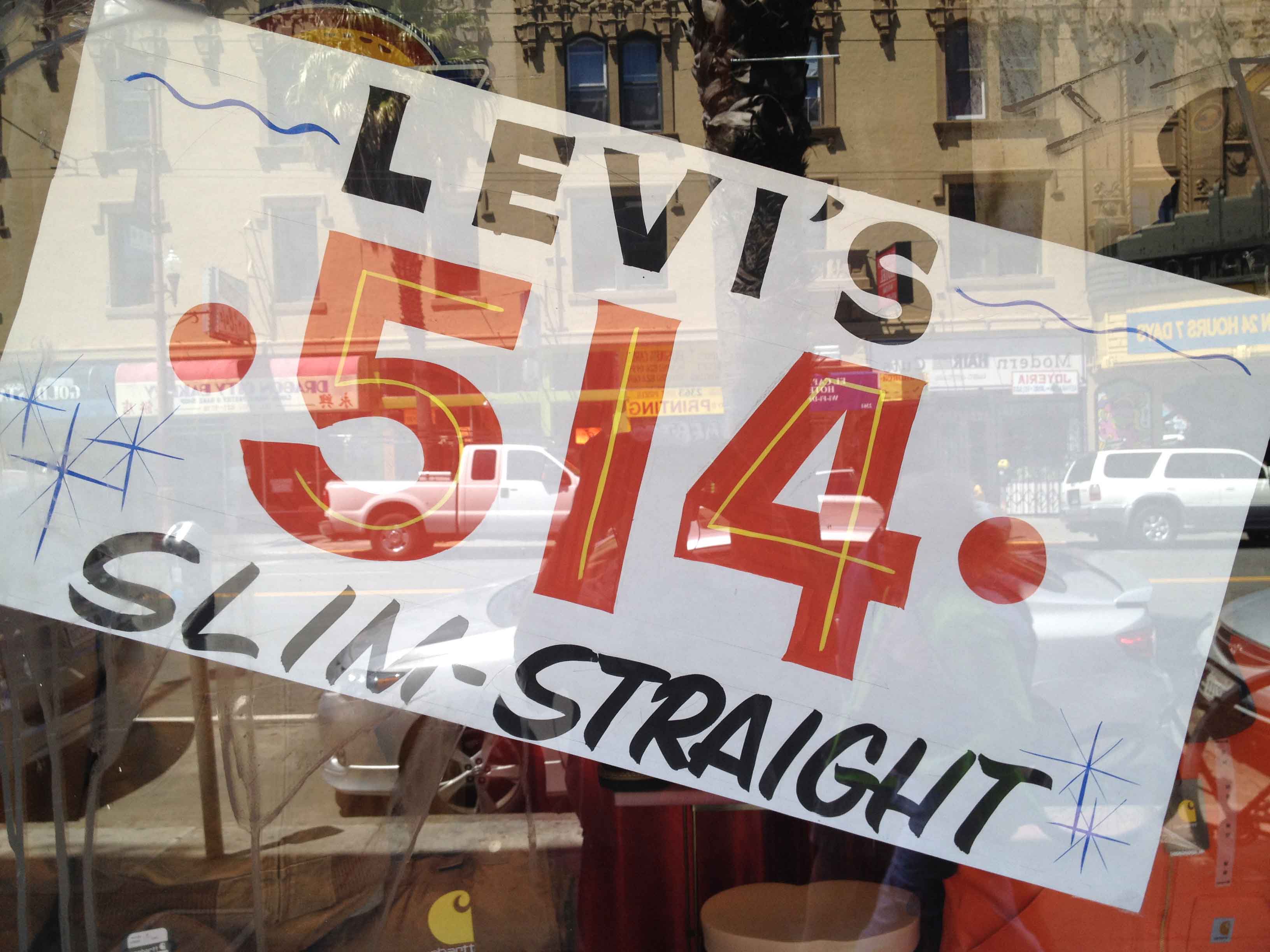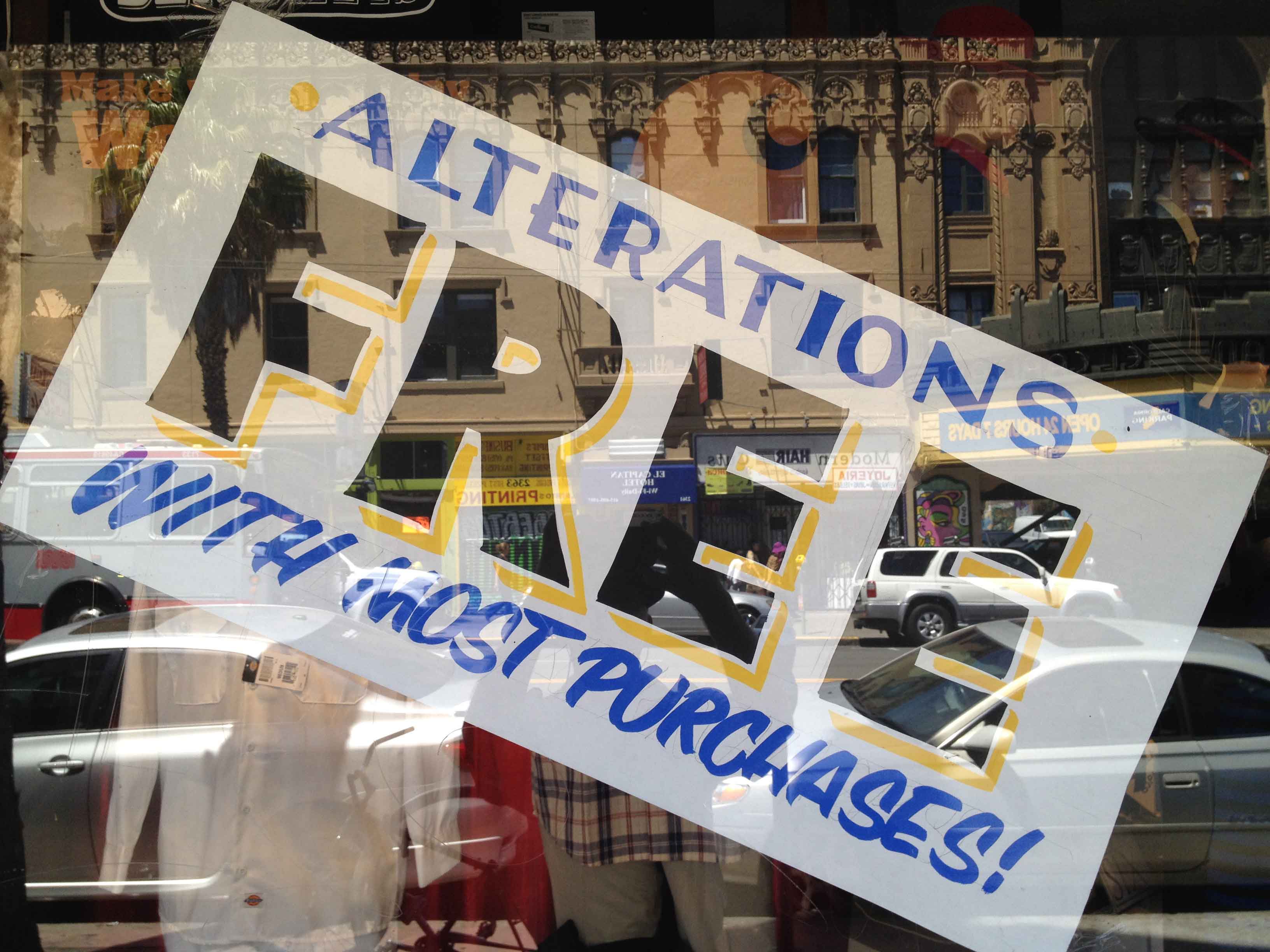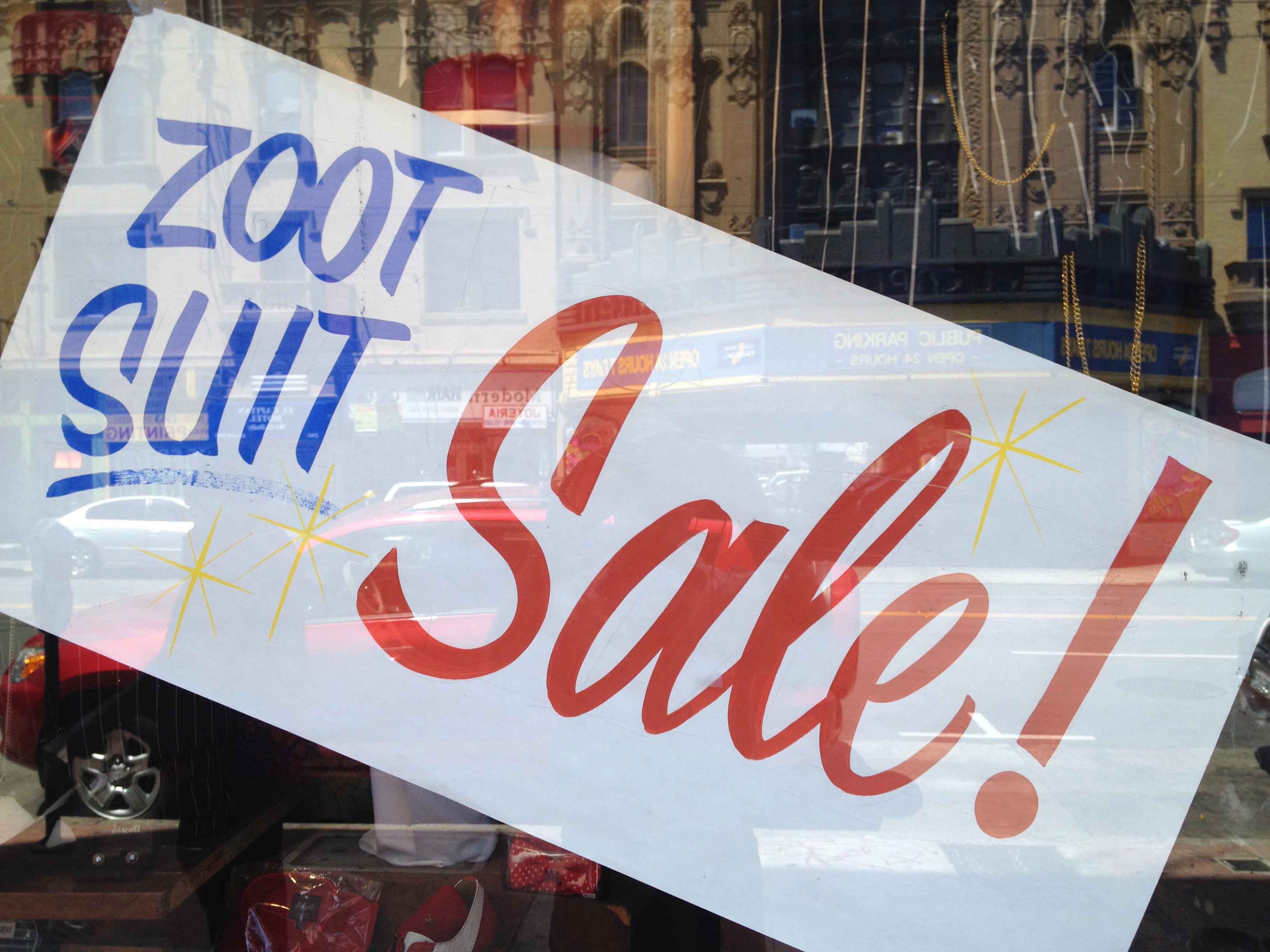 Brush-drawn zoot suit sale sign by Bonnie. Siegel’s Clothing Superstore, 2366 Mission Street, San Francisco, CA.