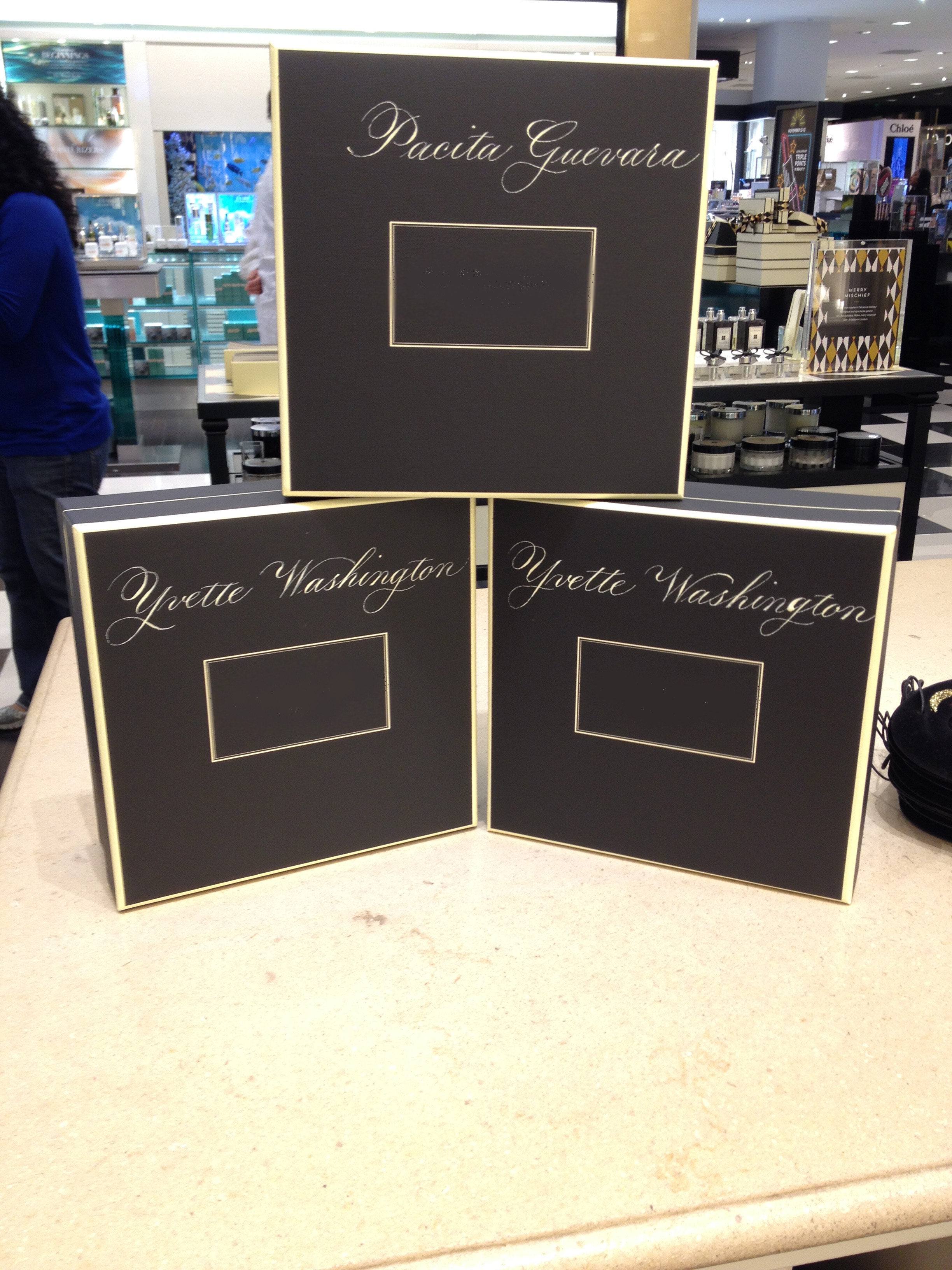 Copperplate calligraphy on fragrance boxes.