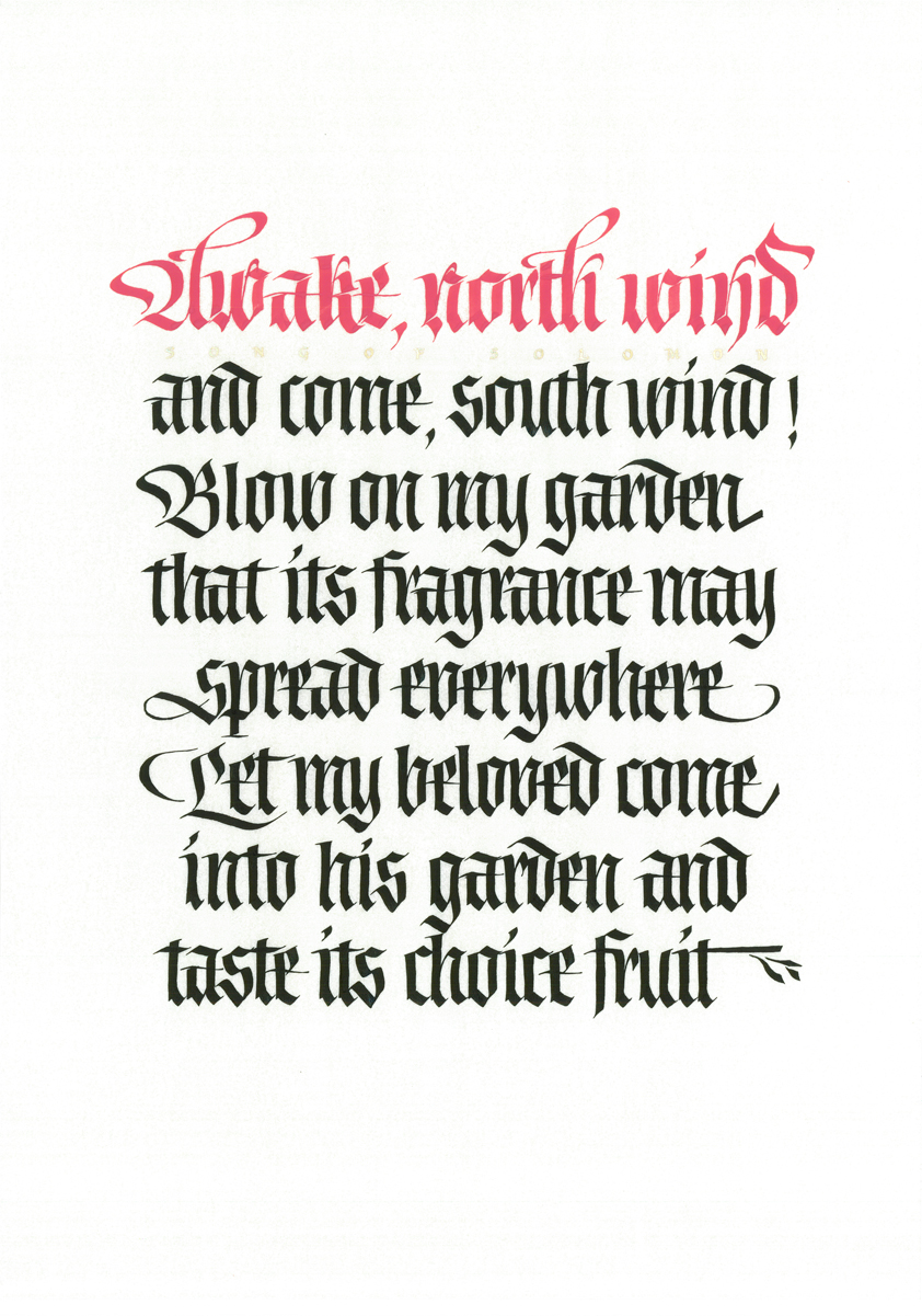 From the Song of Songs, chapter 5. Media: gouache, sumi ink and gold leaf on white pergamenata.